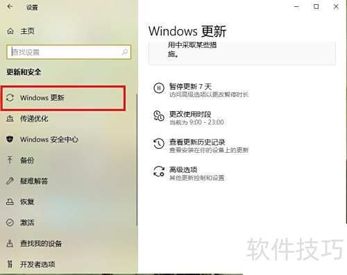 - 在更新和安全界面左侧选择Windows 更新,可设置暂停更新及调整使用时间。