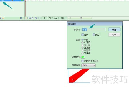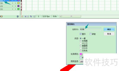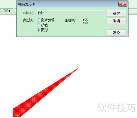 使用绘图工具创建一个圆形。 调整颜色设置为红色并透明化边缘线以保持圆形轮廓清晰。 将图形转换为元件,命名为“秒针”。 旋转该元件使其成为秒针形状。 在时间轴上锁定这个元件层。