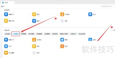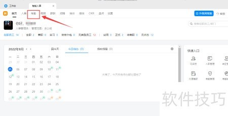 - 进入工作台,点击人事管理,选择智能人事功能。