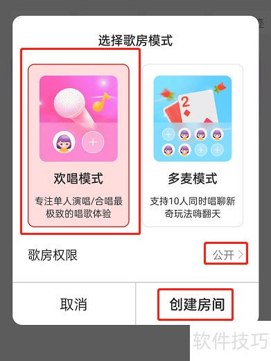 - 进入歌房模式,设置权限后点击创建房间即可。