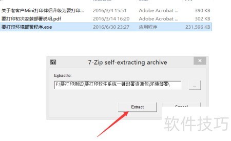 双击运行要打印的环境部署程序.exe,弹出解压窗口,点击Extract。解压完成后,生成名为要打印环境部署程序的文件夹,随后进入该文件夹继续操作。