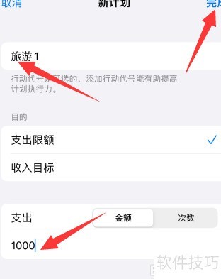 进入新计划页面,填写支出名称和金额,点击右上角完成按钮,即可成功添加支出计划。