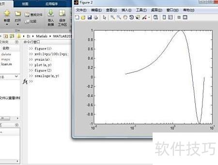 第二,使用semilogx、semilogy和loglog命令绘制对数坐标下的二维图形。在命令窗口中依次输入相应代码,生成并显示Figure Figure Figure 幅图表,分别呈现不同对数坐标形式下的数据可视化效果。