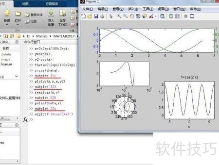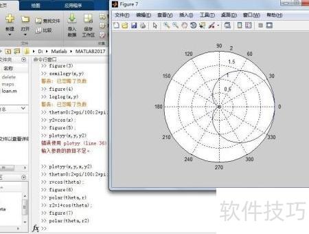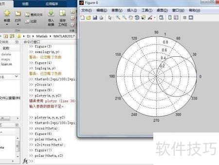 第五,使用polar命令绘制二维极坐标图形。在命令窗口中输入相应代码,生成并显示Figure Figure 个图形。