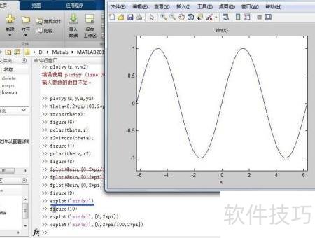 第五,利用fplot和ezplot命令,依据函数表达式绘制二维图像。在命令窗口中依次输入相应代码,生成并显示图图图