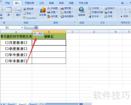 - 选中B2单元格,点击工具栏中的插入函数按钮。