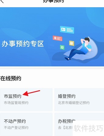 - 进入办事预约页面,选择在线预约,点击市监预约即可。