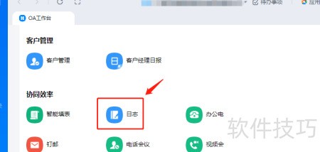 - 进入OA工作台后,下滑页面,在协同效率栏目中点击日志选项。
