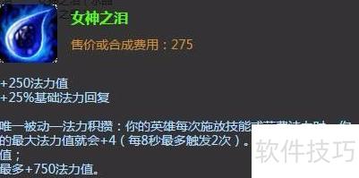 引荐女神之泪,前期不可或缺,中期需依靠其提升的法力值,确保持久战斗力。