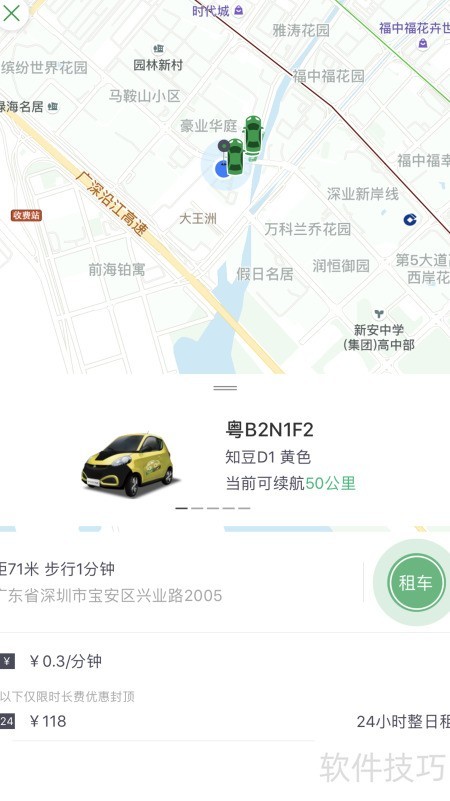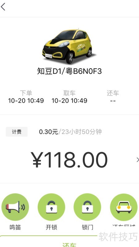 - 车辆须停入指定还车区方可完成归还,点击还车区域可查询最近站点位置。