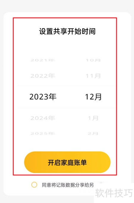 - 进入页面后选定共享起始时间,点击开启家庭账单即可使用。