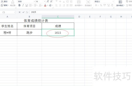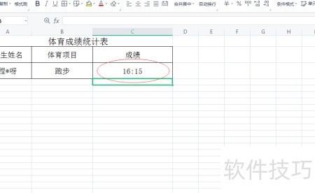 - 在成绩对应的单元格中输入1615,系统将自动显示为16:15的分秒格式。
