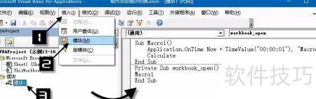 在VBE编辑器中按F激活宏功能,从“插入”菜单中选择“模块”,接着在项目资源管理器中选定新创建的模块,最后在右侧代码区编写所需代码。