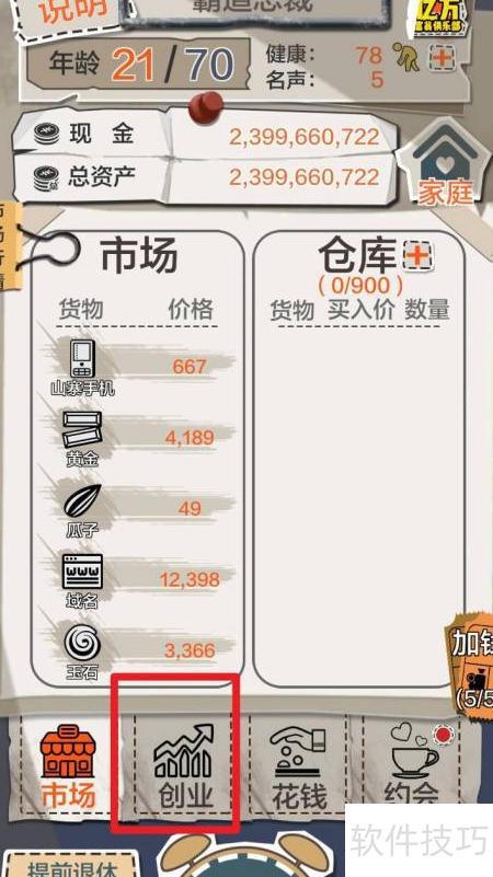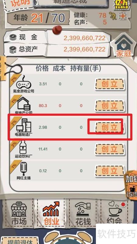 - 打开一亿小目标游戏,进入创业功能界面。