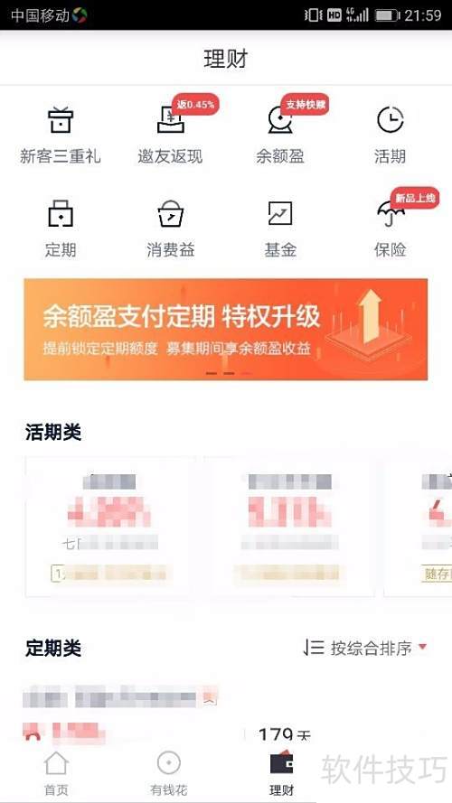 - 在理财页面,用户可根据需求选择基金、定期或活期等投资方式,操作简便,所示。