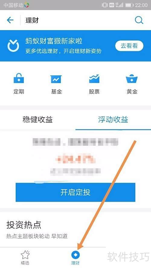 - 进入理财页面后,按需选择定期、基金、股票等产品类型,具体操作示。