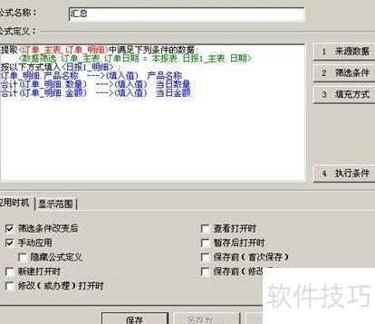 - 创建表间公式,命名为汇总,并设置为筛选条件变化时自动执行及支持手动执行。