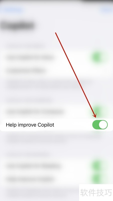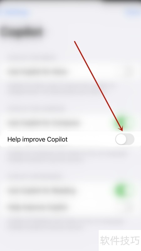 - 在设置页面中,点击Help improve Copilot选项右侧的圆点。