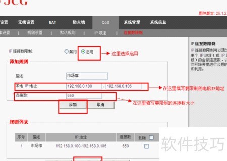 在路由器设置中,连接数(Concurrency)指的是设备能够同时维持的并发网络连接数量。每个设备与外部服务器之间建立的点对点通信通道数量。每个路由器的连接处理能力是有限的,当部分设备占用过多的连接资源时,其他设备将无法正常接入网络。例如,一些P类应用程序可能会发起大量连接请求,迅速耗尽路由器的连接资源,导致网络拥堵或中断。传统IP限速措施虽然可以限制下载速度或上传速度,但对网络连接数量的控制能力有限。因此,为了保障网络的稳定和流畅,除了传统的IP限速措施,还需要结合对单个IP的最大连接数进行限制。通过同时实施带宽限制和连接数限制,可以双管齐下,有效避免个别设备过度占用网络资源,从而确保多用户环境下的流畅体验。接下来,我们将以JCG JHR-N型号路由器为例,详细介绍如何设置IP连接数限制功能,帮助您优化家庭或办公网络的运行效率与稳定性。 登录路由器管理界面: - 打开浏览器,输入路由器的IP地址,例如路由器品牌和型号提供的具体地址,然后按Enter键。 - 输入您的用户名和密码登录。如果忘记密码,通常可以点击“重置”按钮重置路由器,或者联系您的电信/移动/联通等网络服务提供商获取帮助。 进入网络设置: - 登录成功后,通常会看到一个“设置”或“管理”菜单,点击进入。 配置IP连接数限制: - 在设置菜单中找到“网络设置”或“连接”部分,点击进入。 - 进入后,找到“IP连接数”或“连接数”选项,点击进入。 - 点击“设置”或“编辑”按钮,选择“最大连接数”或“最大并发连接数”,根据您的需求输入一个合适的数值。例如,如果您希望限制到每个IP地址的连接总数为,您可以输入“。 保存设置并退出: - 设置完成后,点击保存或应用更改按钮,确保更改生效。 - 最后,退出路由器管理界面,返回您的网络环境。通过以上步骤,您可以设置IP连接数限制功能,确保路由器的带宽资源不会被过度消耗,从而保持网络的流畅和稳定性。如果您需要进一步的帮助,建议联系您的网络服务提供商获取专业指导。