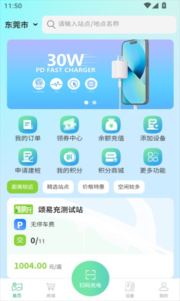 颂易充是东莞市东颂电子有限公司打造的充电软件,它整合了多地多个充电平台的服务资源,还实现了跨地区的一站式充电尝试。张开软件首页上险些就聚合了一切作用,好比积分商城、增添设施、领券核心等。