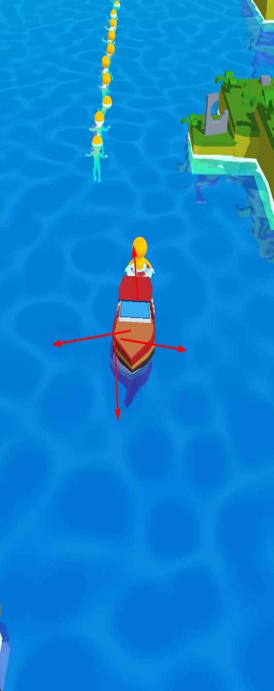 - 操控红颜色划子在蓝色水域中移动,船上有黄色小人,需引导划子在水域中飞行,搜集其他黄色小人。