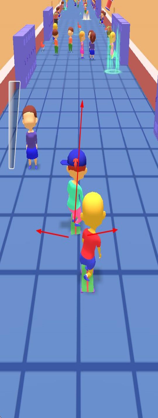 - 操纵角色踩滑板在走廊滑行,经过阁下移动、转向,避让行人、障碍物,维持前进。