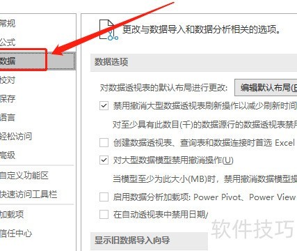 - 在Excel选项窗口中,选择数据选项卡,操作所示。