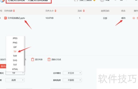 - 在下拉菜单中选择TIF格式,点击开始处理按钮,即可将PPTX文件转换为TIF格式。