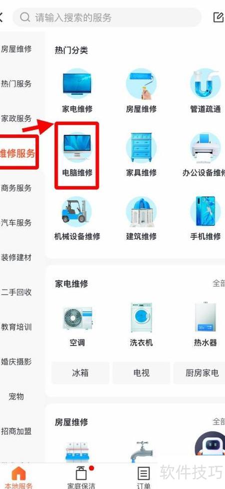 - 选择左侧维修服务,再点击右侧电脑维修选项。