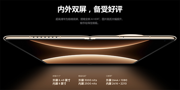 在这个屏幕上,它的内外屏均采用了华为最先进的临境显示技术。外屏为寸OLED屏幕,分辨率为峰值亮度达到its;内屏则是一块寸的OLED显示屏,拥有分辨率和最高的its亮度。
