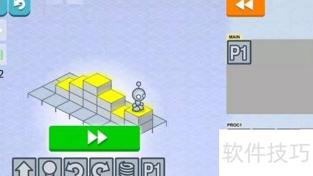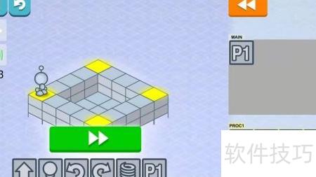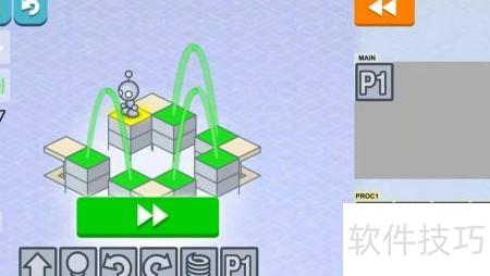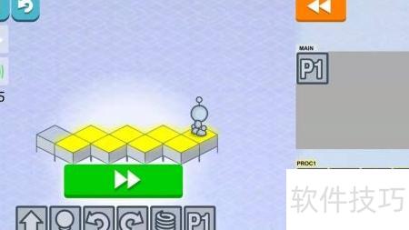 将重复操作整合进PROC令,构成循环结构,相当于编程中的定义一个可重复调用的方法。嵌入P令后,系统会持续执行该过程,实现自动化循环。图中箭头代表前进方向,灯泡符号表示亮灯或跳跃动作。具体操作流程已清晰标注在图片右侧,按提示逐步完成即可顺利通关。