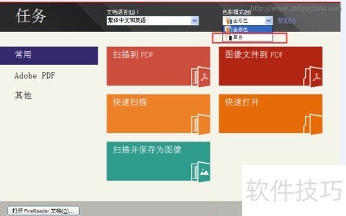 在ABBYY FineReader 色彩模式下拉菜单中,选择全彩色或黑白模式。注意:一旦转换成黑白,原色将不可逆。