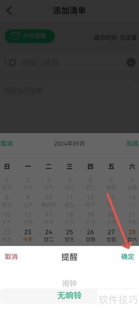 - 进入提醒设置,选择无闹铃并确认,即可关闭清单提醒。