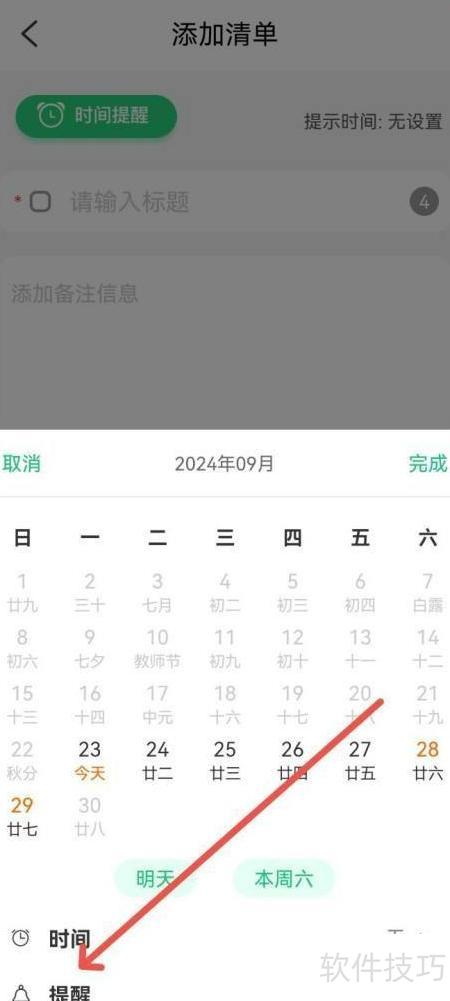 - 启动闹钟应用,进入清单添加界面,选择时间提醒功能。