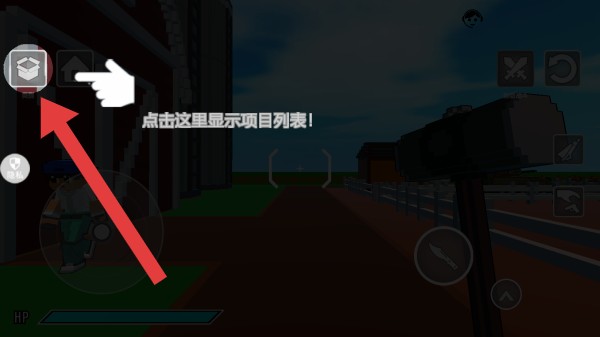 - 游戏提醒玩家点击左边带箭头所指的按钮,可显现项目列表,界面中具有生命值hp显现、虚构摇杆及其他操纵按钮。