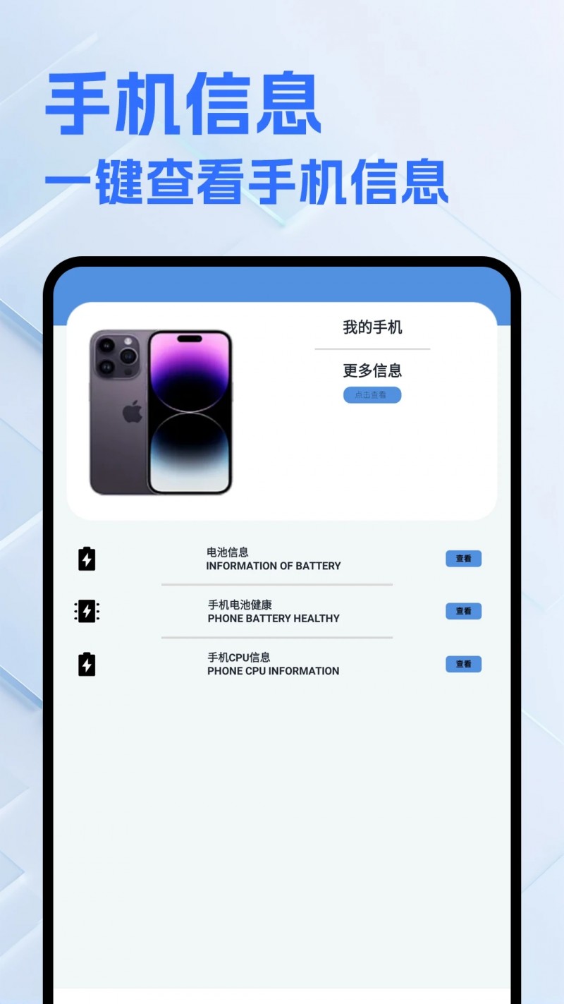 - 手机信息一键把握:快捷检察设施概况,囊括电池信息、手电机池健康、手机cpu信息,让手机信息了如指掌。