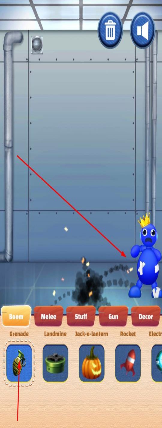 - 进入游戏界面,在下方分类栏选boom类工具,如点击grenade手雷,将其拖至蓝色戴皇冠角色处,触发互动成效。