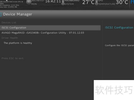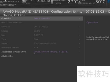 - 选择Avago SAS3408 RAID控制卡,按下回车键,进入主界面,所示。