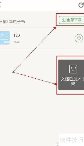 点击全部下载或书名旁的下载图标,完成后若出现“文档已加入书架”的提示,即可确认电子书成功导入手机。