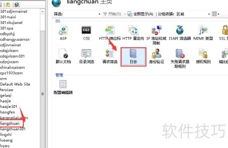 在IIS中找到目标网站,双击打开右侧菜单栏,接着在右侧的“日志”标签页点击进入。如果可以直接编辑的话,省略第四个步骤直接进行第五个步骤;如不能直接操作,则需先执行第三个步骤以开启网站日志功能。