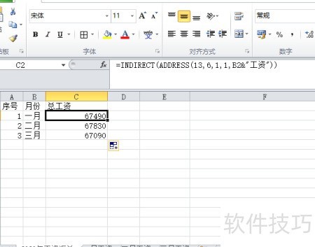 在汇总表的C元格中输入公式:=INDIRECT(ADDRESS(Bamp;工资)),然后向下填充即可完成数据引用。当后续四月、五月的工资表制作完成后,只需在月份列添加对应名称,再将公式继续下拉,系统便会自动读取新表数据,实现快速汇总,操作简便高效,极大提升工作效率,适用于多月连续数据整合场景。