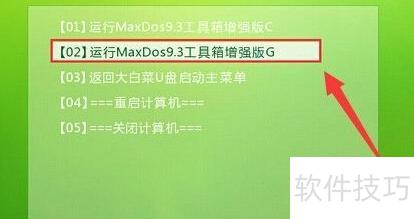 将制作好的大白菜U盘插入电脑的USB接口,开启BIOS设置为从U盘启动,重启后在大白菜主菜单中选择运行MaxDos工具箱增强版并按回车确认执行。