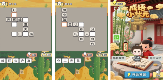 在这部名为三国权力的游戏里,你将扮演一名普通士兵,在历史的战场中一步步成长。游戏的故事背景设定在三国时期,其中蕴含着丰富的成语知识。游戏界面分为三个区域:上方是多个交叉成语及缺字位置的展示;中间部分提供了提示、重玩等功能按钮;下方则是可以选中的汉字。为了晋升官职并最终实现权倾朝野的目标,你需要精准地匹配答案。每一关都充满挑战,考验着你的知识和反应能力。在这个过程中,你将不断成长,从一个普通的士兵成长为一位掌握众多权力的人物。