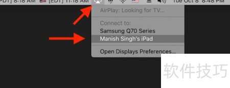 - 点击菜单栏的AirPlay按钮,然后在列表中选择你的iPad设备即可完成连接。