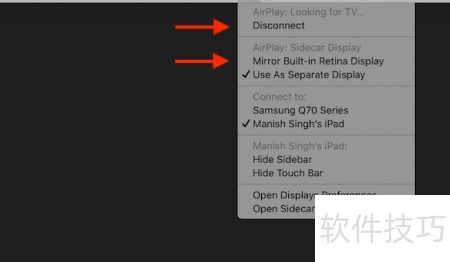 - 也可通过Mac菜单栏进入AirPlay选项,点击断开连接按钮即可完成操作。