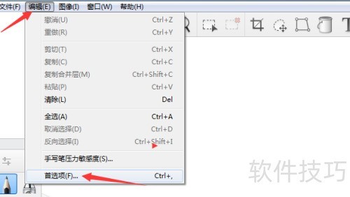 - 点击编辑菜单,从下拉选项中选择首选项进行设置。