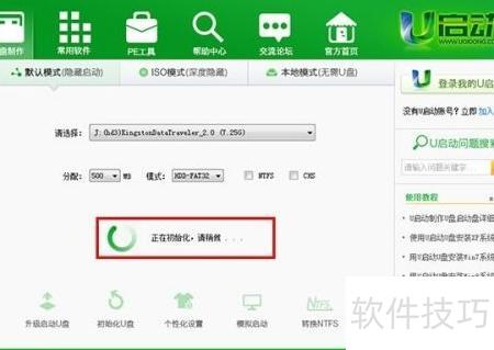 将需要释放隐藏空间的U盘插在电脑的USB接口(注意:此过程会清除U盘中的所有数据,请提前备份)。双击打开“u启动v快捷方式,运行后进入主界面,在默认模式下点击初始化U盘按钮,并按照提示完成操作。
