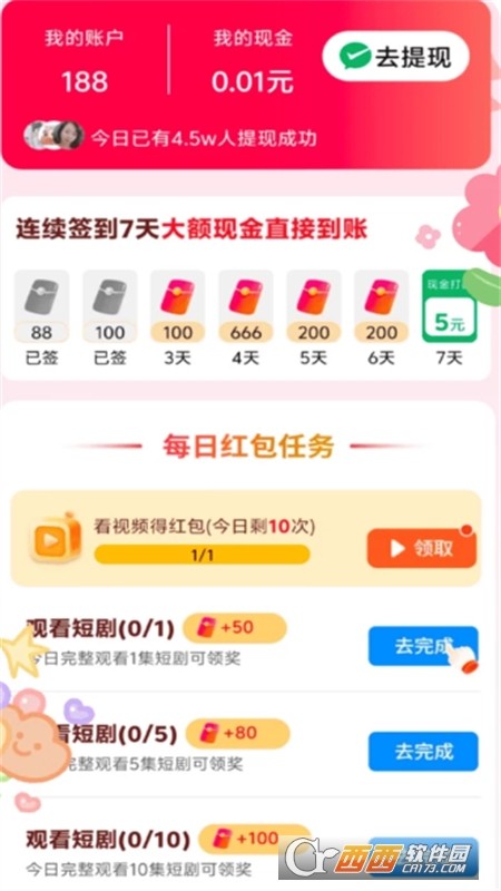 红包奖品与提现功能:寓目短剧的经济引擎在寓目短剧的过程中,您的每一次停留和每一项成就都将为您带来独特的奖品和资金奖励。系统根据您寓目的时间、集数等多种因素,实时发放红包奖品。这些奖品金额会即时显示于您的账户中,方便随时查看并享有。对于需要快速获得资金的用户来说,无需再烦恼如何提取奖励。只需通过微信或付款宝等快捷方式,就能轻松进行提现操作。整个过程便捷高效,让您在寓目短剧的同时,能够迅速提升收益,享受看剧带来的经济回报。软件还特别设计了多个红包任务板块,鼓励您参与多样化的任务挑战。例如签到、邀请好友等,完成这些任务不仅能获得额外的奖励,还能进一步拓宽您的收益路径。通过不断的努力和积极行动,您可以更好地把握每一次机会,提升自身的经济效益。总结来说,寓目短剧不仅是一种娱乐方式,更成为一种经济引擎。在享受精彩剧情的同时,您也将享受到即时的奖品与资金奖励,以及多元化任务带来的额外收益机会。