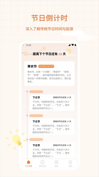 3、提供了传统习俗和起源的相关信息,让用户可以深入了解节日背后的文化内涵,丰富知识积累;