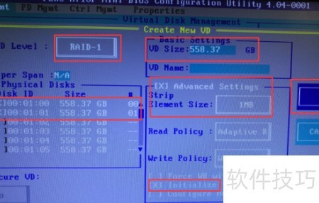 选用RAID-每组包含物理硬盘,在高级选项里设条带宽为B后确认完成设置。